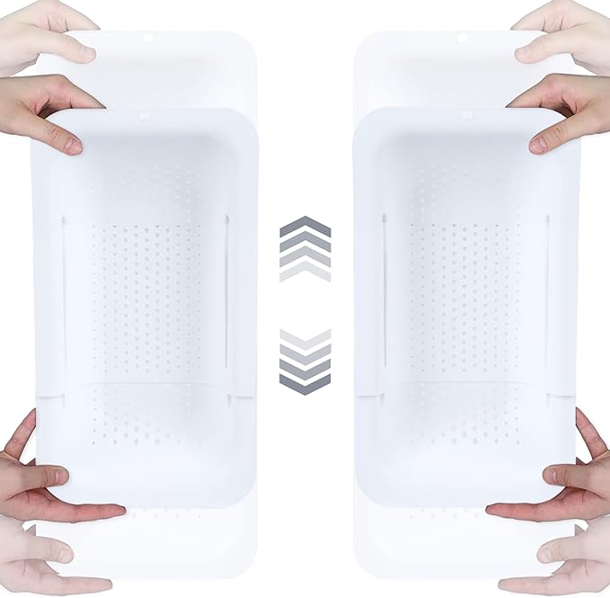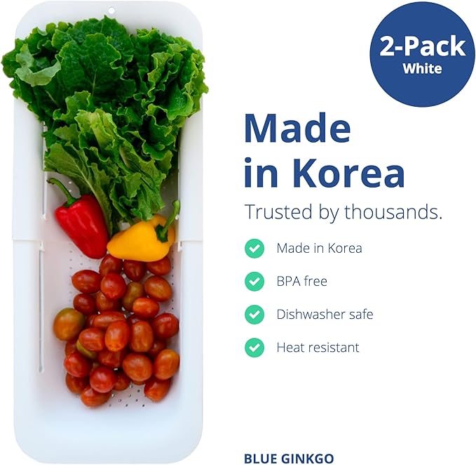 BLUE GINKGO Sink Colander Baskets - (Pack of 2) Wash Vegetables and Fruits, Drain Cooked Pasta and Dry Dishes - Extendable - New Home Kitchen Essentials (2 White)