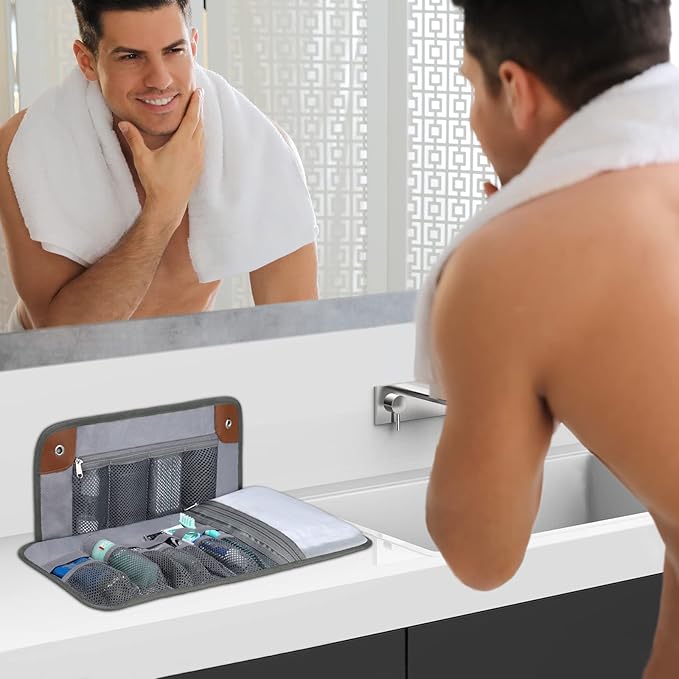 - Compact Design: Men's toiletry bag is inspired by the tool roll, which not only ensures strong storage but also its portability and space-saving on the go. Just roll it up and buckle it up with G-hook and take it away easily. You can also hang them up with dual metal grommets, or spread the dopp kit flat on the bathroom sink to use. It's a clean, hygienic, minimalist way to organize and store all your travel essentials.