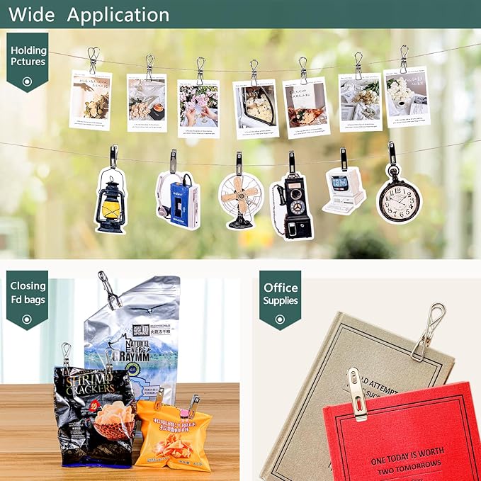 - [Large & Versatile] 1/3 larger in size than other stainless steel clothespins. It can be used as laundry clips, mini clothes pins for photo, clothesline clips, sock clips, towel clip for beach chairs cruise, bag clips for food, potato chip bag clip, snack clips