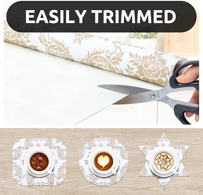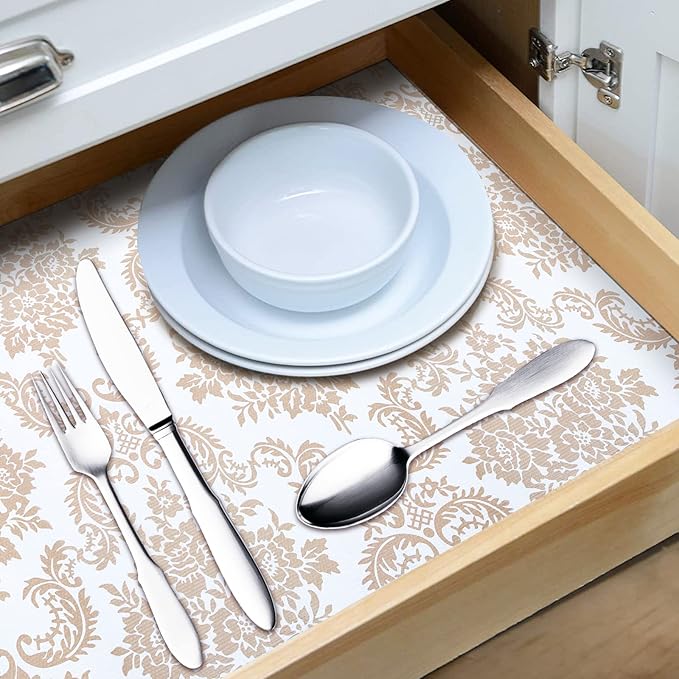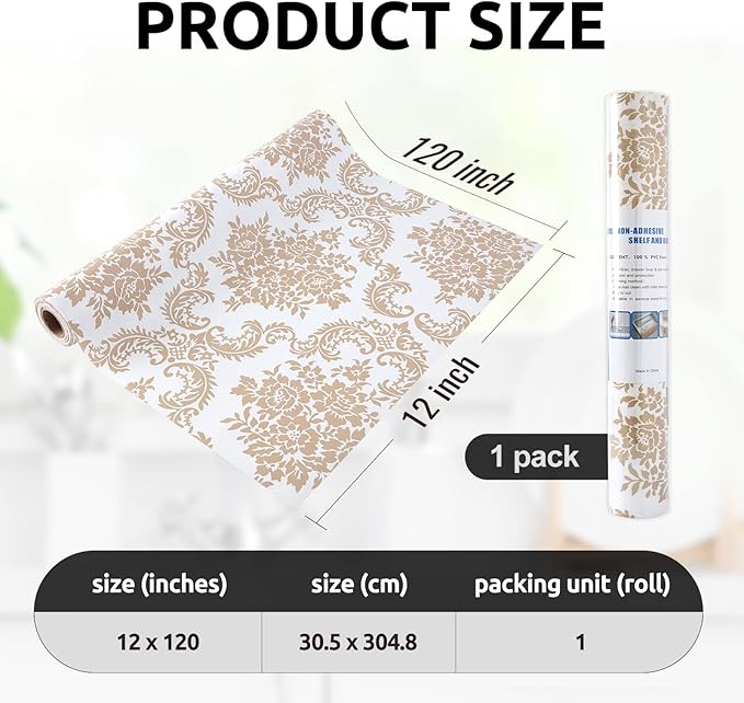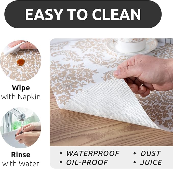 - Elegant Design - The differences of shelf liner between ours and the others is appearance designs. We will take into account the needs of customers for aesthetics. Therefore, to instead of regular plain shelf liners, we thought about European style design, use our shelf liner to decorate your refrigerator, shelf, kitchen, bathroom.