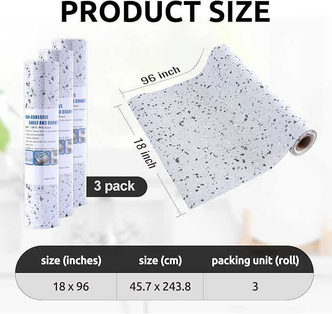 - Details of Shelf Liner - The size of each roll is 18*96 inch, we believe that is perfect wide for the shelves. In addition, it is easy to cut out if you need to modify the size. Moreover, our shelf liner is easy to clean with a towel because it is waterproof and oil-proof.