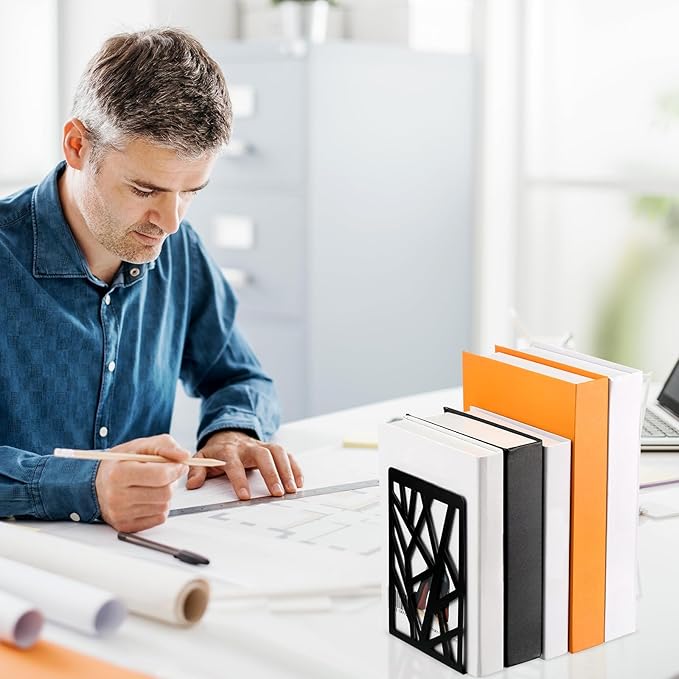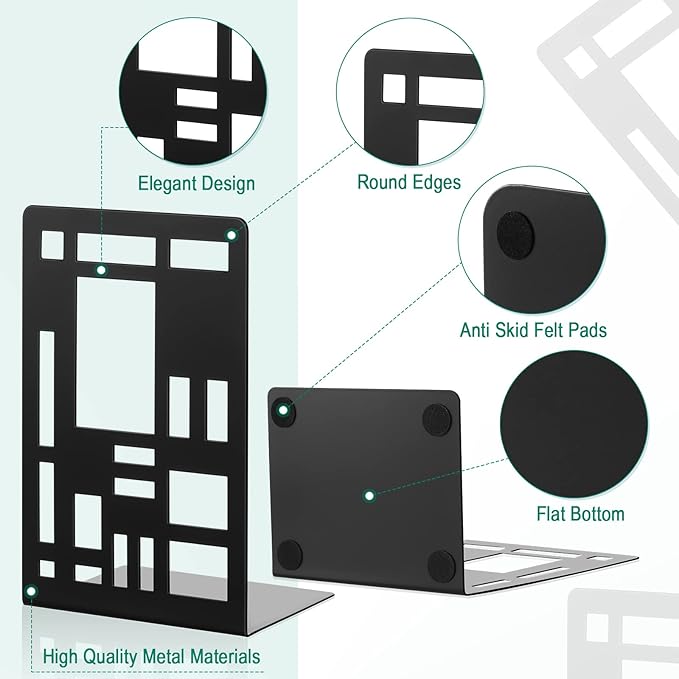 - Elegant Design: the black metal bookends adopts geometrical art hollow out design, powder-coated surface is smooth and anti-rust; The metal bookends is both functional and decorative, suitable for most home or office decoration