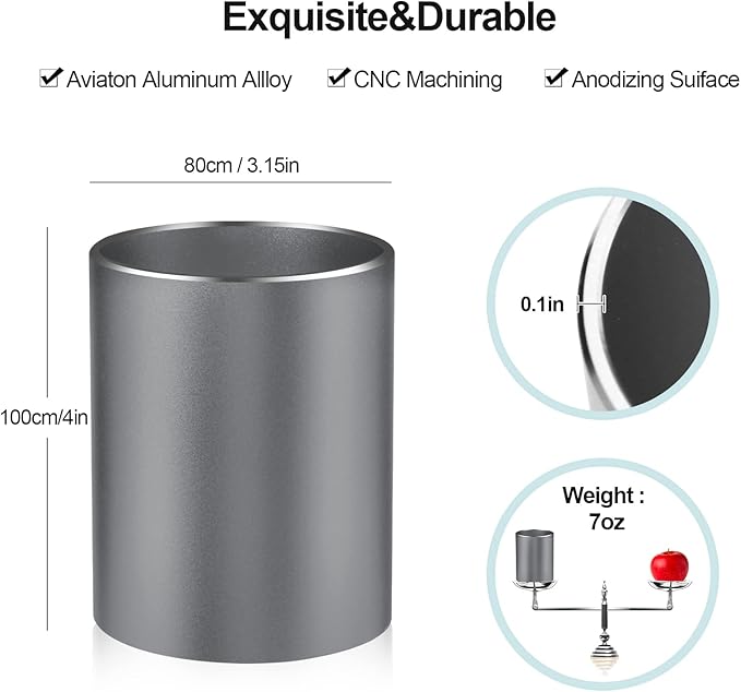 - 【Large Capacity】Diameter: 3.15inch/8cm, Height: 3.93inch/10cm; Weight: 6.2Ounce /176g. This large metal pen holder cup can accommodate about 20 pens.
