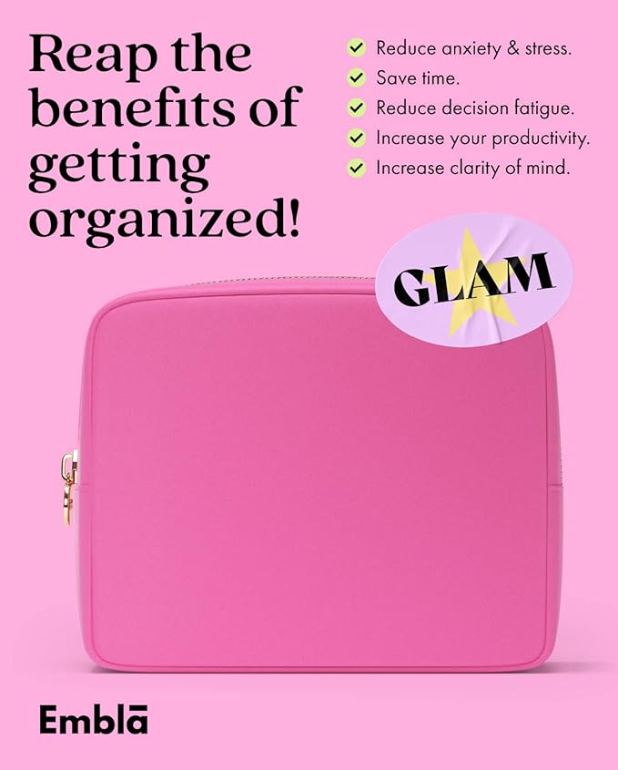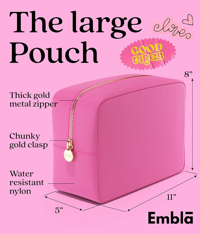 - TRAVEL + CUTE = EMBLA! - Our bags are THE trendy & preppy storage gifts! Simply pick your size (Mini, Large or XL) and start organizing all of your makeup, lipstick, hair stuff, snacks and jewelry accessories! Or use it as a clutch handbag, makeup brush holder, skin care bag, zippered carry case or coin purse wallet!