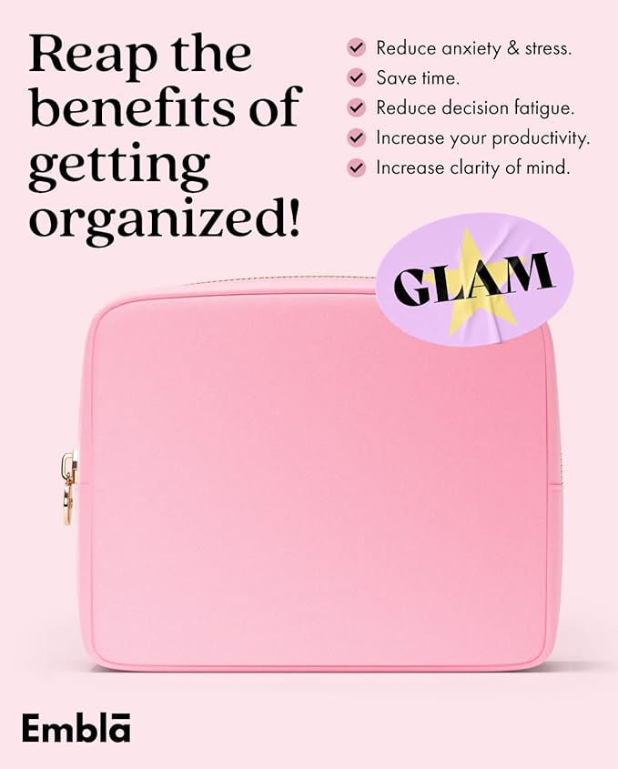 - TRAVEL + CUTE = EMBLA! - Our bags are THE trendy & preppy storage gifts! Simply pick your size (Mini, Large or XL) and start organizing all of your makeup, lipstick, hair stuff, snacks and jewelry accessories! Or use it as a clutch handbag, makeup brush holder, skin care bag, zippered carry case or coin purse wallet!