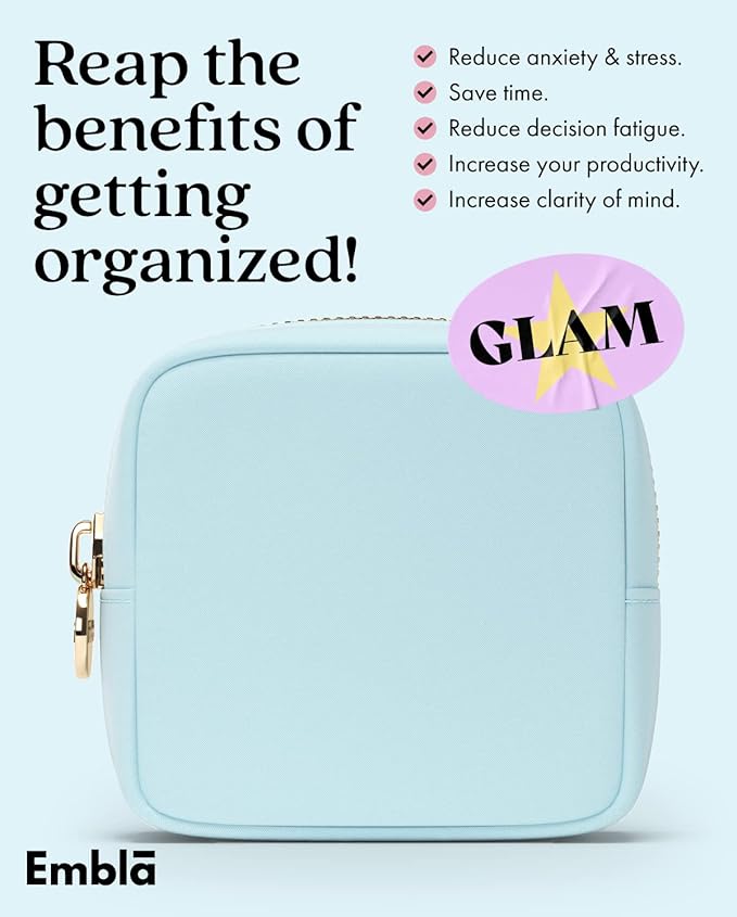 - TRAVEL + CUTE = EMBLA! - Our bags are THE trendy & preppy storage gifts! Simply pick your size (Mini, Large or XL) and start organizing all of your makeup, lipstick, hair stuff, snacks and jewelry accessories! Or use it as a clutch handbag, makeup brush holder, skin care bag, zippered carry case or coin purse wallet!