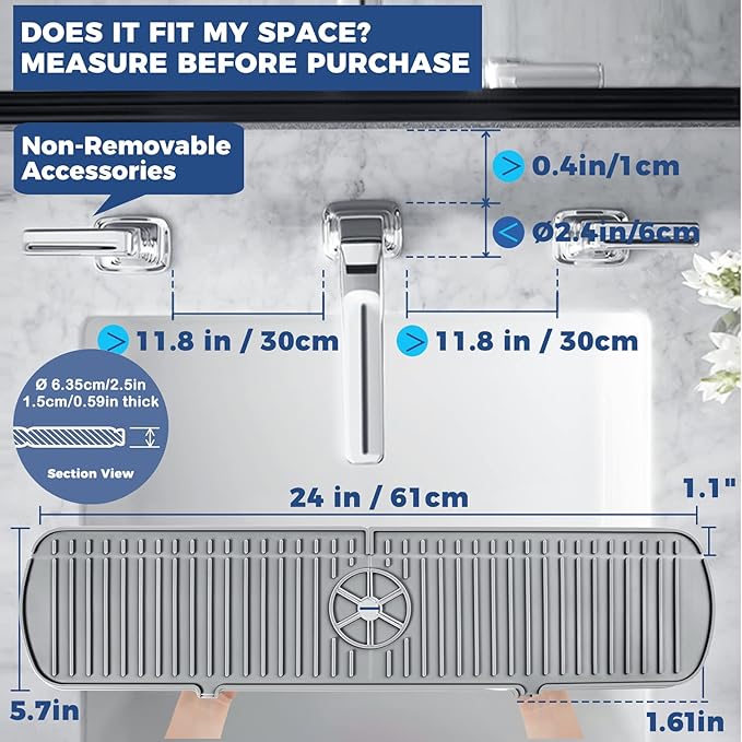 - That there must be no obstructions within a length of at least 11.8 inches on the left and right sides of the faucet. Otherwise there is not enough space to put silicone faucet handle drip catcher tray.