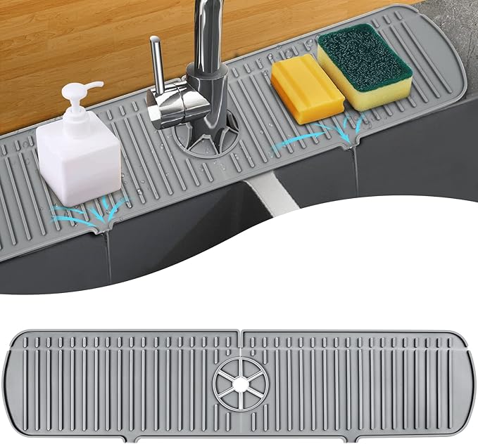 - ๐ชใMULTIFUNCTIONใ It's not only a faucet drying mat, it also a sponge holder for kitchen sink, dish soap tray, dish drying mat. For kitchen: put sponge, dish soap, detergent, brush, and bottle on it. Upgrade the size of the increase, you can put more kitchen small things. Make your sink cleaner. Used as an organizer mat, drain pad. It is a super practical kitchen & bathroom gadgets.