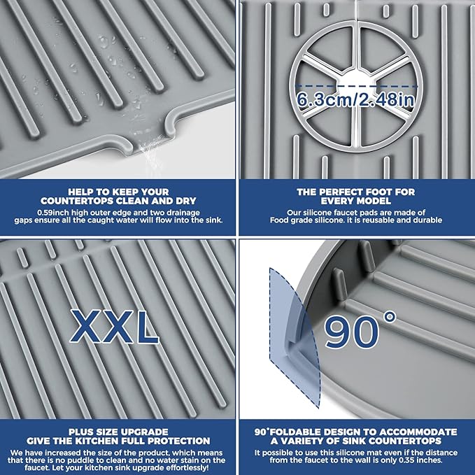 - ๐ชใKEEP YOUR COUNTERTOP DRYใ Silicone faucets pad new designed for faucet splash with the draining, upgrading your kitchen sink & bathroom countertop in an effort-saving way! This means never gets soggy, or any water spots by the faucet. You don't need to worry about the water staying on the mat or counter.
