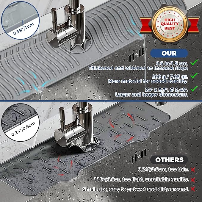 - ๐ชใXXL PLUS SIZEใ XXL Size: 24"(61cm) x 5.55"(14.1cm) , ร 2.48"(6.3cm) Diameter single faucet hole. Unlike other products, we have increased the size and weight of our products. XXL super size design for faster, smoother drainage and faster drying. Upgraded supersize, wider space protection, this means no puddles to clean up & no water spots by the faucet. Give your kitchen sink an effort-saving upgrade!