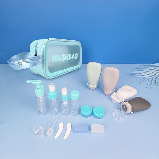 - [PACKAGE INCLUDED]: 4 X Silicone Bottles (3oz/90ml),1 X Lotion Bottle (1.7oz/50ml),1 X Spray Bottle (1.4oz/40ml),1 X Spray Bottle (1oz/30ml), 2 X Jar (0.3oz/10ml), 2 X toothbrush Cover,2 X Scoopers,1 X Funnel,1 X Dropper,1 X Label,1 X Bag.(This bag can hold everything in this suit, just right travel size toiletries)