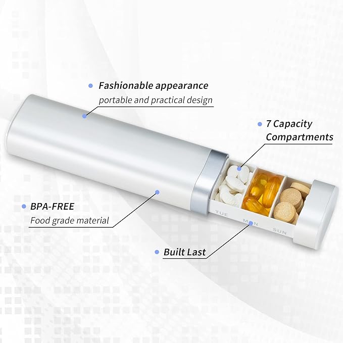 - SAFE & STYLISH —— BPA-Free, Odorless & Modern Colors. Made from safe, BPA-free, odorless material with a smooth interior. Available in modern, cute colors that fit your style—perfect as a compact pill organizer, travel pill case, or purse-friendly weekly pill box