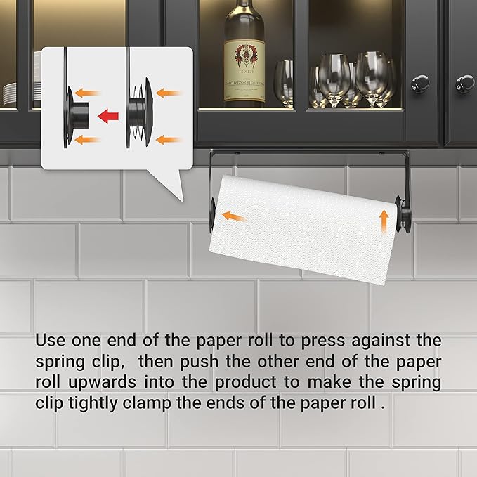 - ONE HAND TEAR PAPER WITHOUT NOISE: Spring Hanging Paper towel holder home and kitchen definitely works well to Stop unrolling the whole roll when you are trying to zip a couple sheets off, One hand tear paper without any nosie.Improve user experience.