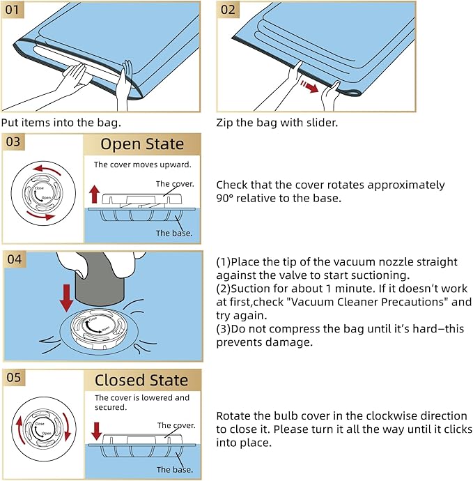 - Multi Work Methods: Using vacuum seal bags for clothes are suitable with most vacuum cleaners in the market, also can be used to compress and exhaust by a pillow, realize the freedom of various air extraction tools