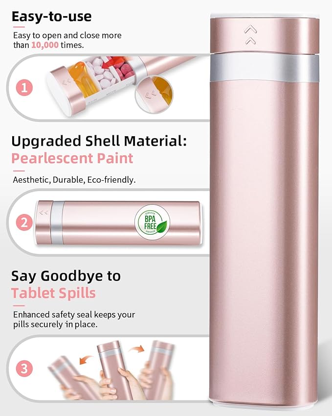 - Special Feature : BPA-Free - Upgraded with a pearlescent coating for maximum pill protection., Easy to Use - Ideal for those with limited grip strength or arthritis., Long-lasting - Outlasts 20% of similar products, with over 10,000 uses. Reliable for daily use., Ultra-Portable - Fits in your pocket, perfect for travel. BPA-Free - Upgraded with a pearlescent coating for maximum pill protection., Easy to Use - Ideal for those with limited grip strength or arthritis., Long-lasting - Out… See more
