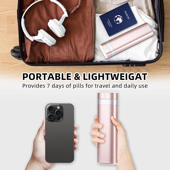 - [Compact for Travel] Fits Easily in Purses, Bags & Carry-Ons. Sized at 6.53" × 1.69" × 1.7", this lightweight travel pill organizer slips smoothly into handbags, backpacks, and carry-ons. A true travel essential designed for vacations, work trips, and everyday medication or supplement storage