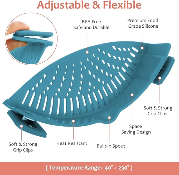 - ✎【 DURABLE & HEAT RESISTANT 】 Silicone strainer clip on are made of safe and non-toxic silicone, BPA Free, Dishwasher safe. Silicone Food Strainer can stand the temperatures 230°, and will not break, burn or melt over time