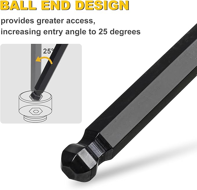 - Ball end design helps you to reach and open screws up to a 25 degree entry angle; T-handle with non-slip grip provides greater torque to loosen and tighten fasteners.