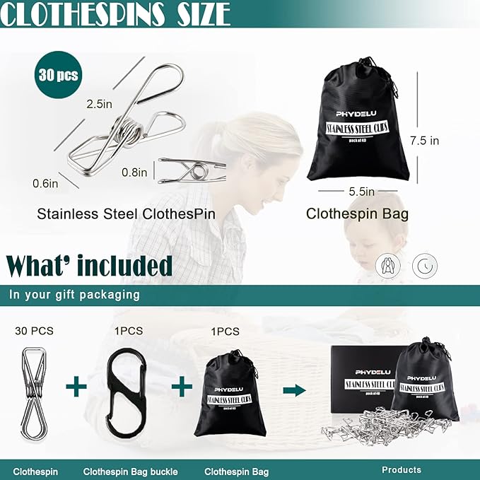 - [Products Include] 30 Clothes Pins , 1 clothespin bag, 1 clips bag buckle. Clothes pin made of 304 stainless steel, resisting and durable. Clothes Pins bag made of Black oxford cloth, Sturdy and unbreakable, Convenient for storing clothespins and drying clothes