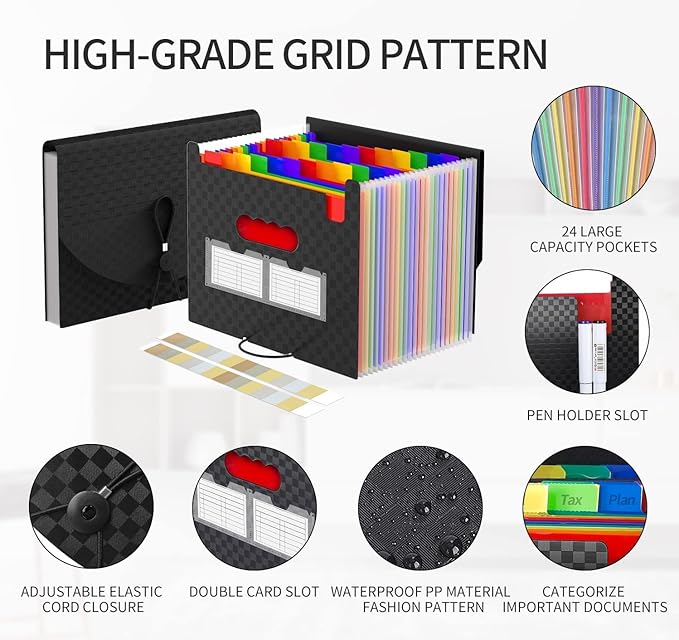 25 Pockets Accordion File Organizer Expanding File Folders,Expandable Document Organizer Plastic Accordian Filing Folder,A4/Letter Size Paper,Portable File Box,2 Tabs, Upgraded Grid Pattern