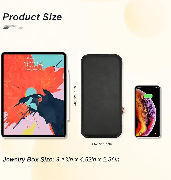 - TRAVEL JEWELRY CASE - The jewelry box is lightweight and portable: 9.2" x 4.53" x 2.25 (23.4cm x 11.5cm x 5.7cm ) so that it is easy to place inside a bag or a luggage suitcase. It's super convenient for journeys, travel, weekend trips, or business trips.