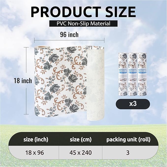 - Excellent Material - The shelf liners are made of excellent PVC material that is non-adhesive and non-slip. To reduce slipping and bunching in your drawers or cabinet shelves, we have added a non-slip texture design on the bottom that increases friction, keeping the liner in place on surfaces and preventing items from moving.