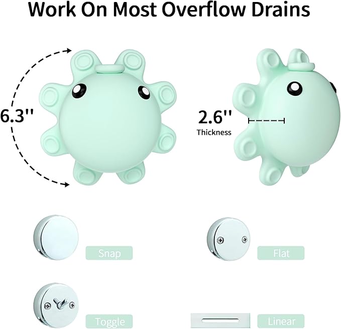 - Perfect Size Fits for Most Drains: 4'' diameter wide and 2.7'' depth. The bathtub drain covers fit commonly found bathtub overflow drains, like toggle/trip lever, flat, or snap drain types. This bathtub drain cover is made of food-grade silicone. 💖Can be used to Prevent Babies from Hitting Their Heads. This cute bathroom accessory will help turn bath time into a more fun, colorful, and enjoyable experience!