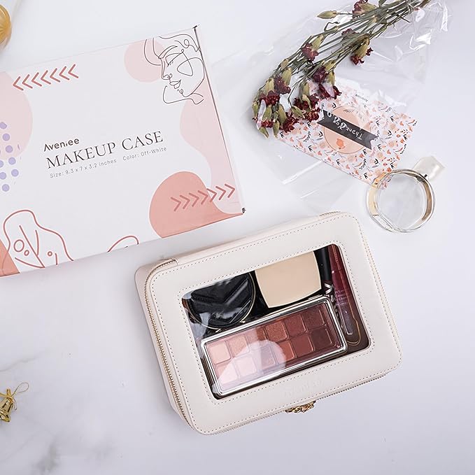 - ❤【LUXURY DESIGN】Measuring 9'' x 6.5'' x 3''(23cm x16.5cm x 7.8cm), our makeup bag is leek and stylish, this makeup travel organizer was designed in a minimalist boxy shape and a sweet off-white color. Crafted in beautiful PU leather and finished with polished hardware, it's the clear pouch you'd be happy with sitting out on display beside you.
