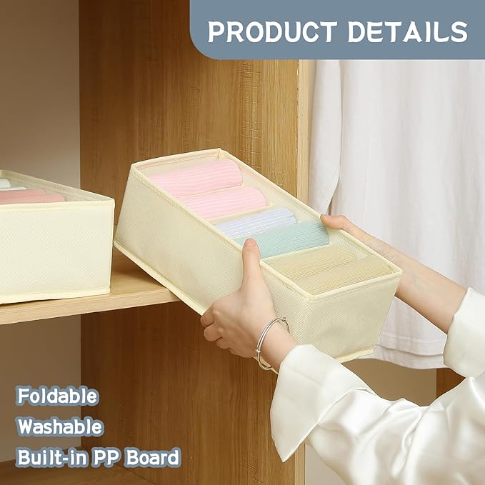 Qozary 3 Pack Sock Underwear Drawer Organizer Dividers, Non-Woven Fabric Collapsible Cabinet Closet Storage Boxes for Clothes, Socks, Lingerie, Underwear, Tie, Belt, Baby, Bedroom (Beige, 6 Cells)