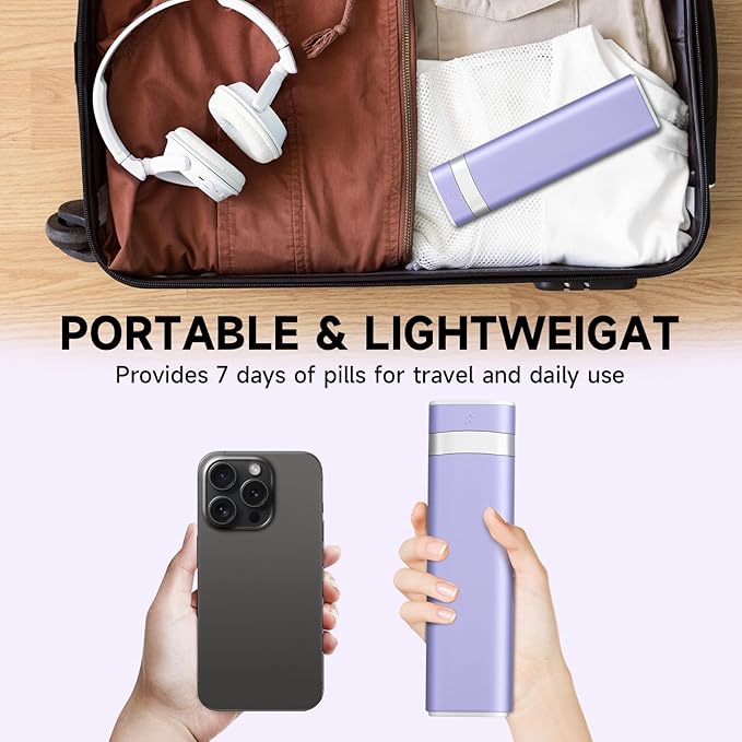 - COMPACT FOR TRAVEL —— Fits Easily in Purses, Bags & Carry-Ons. Sized at 6.53" × 1.69" × 1.7", this lightweight travel pill organizer slips smoothly into handbags, backpacks, and carry-ons. A true travel essential designed for vacations, work trips, and everyday medication or supplement storage