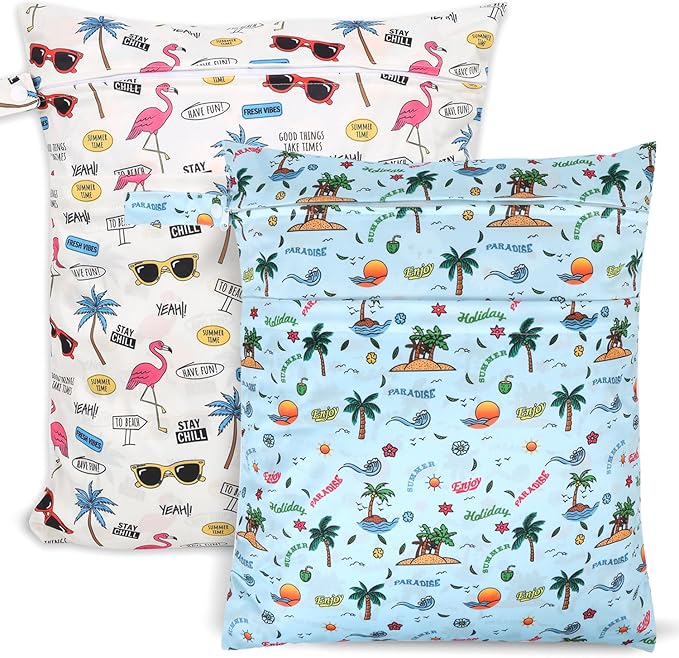 - 2 ZIPPERED POCKETS & HANDLE DESIGN: The 2 pack laundry bags are designed with 2 zippered compartments to keep wet and dry clothes separately, or separate dirty and clean diapers. Keep dry and clean. There's a handle with a button on one side for hanging up, convenient to carry and attach to your stroller, doorknob, towel rack, hook or handbag.