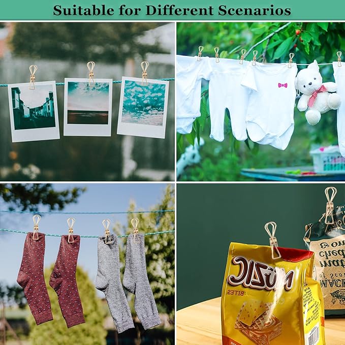 - WIDE APPLICATIONS: The metal clips work perfectly for outdoor or indoor use. Can be used to dry clothes, travel clothesline, also used as gathering clips for photos, cards, paper and sealing clips for foods, snacks,ect.