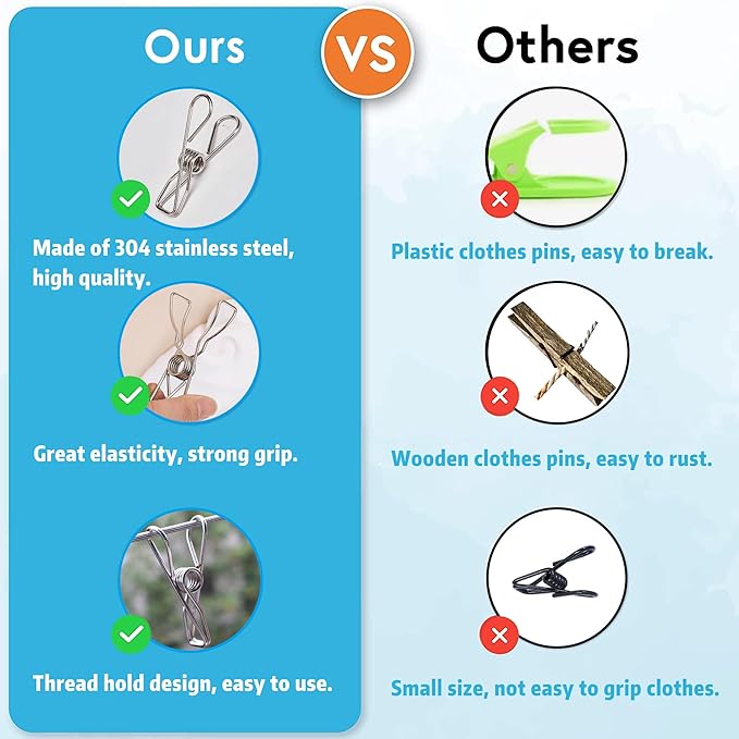 - Premium Quality: These clothespins are made from high quality 304 stainless steel, strdy and anti-rust, not easy break. Have smooth edges that won't snag, tear or damage your clothes. Much better than plastic or wooden pins.