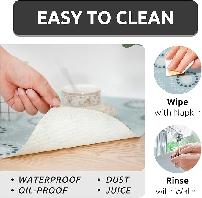 - Details of Shelf Liner - The size of each shelf liner is 18*96 inch, We've looked into the dimensions of many shelves and cabinets, in addition to the 18inch width, we also added 16inch and 12inch widths to ensure customers can choose the size they want. Moreover, our shelf liner is easy to clean with a towel because it is waterproof and oil-proof.