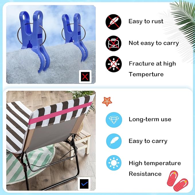 - EASY TO CARRY -- Our beach chair bands for towel are super small and lightweight, thery are more space-saving than messy clips, easier to carry and make your vacation more enjoyable.