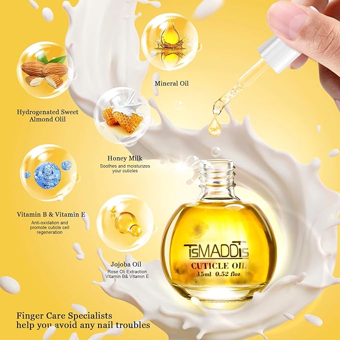 - Nail Cuticle Oil: 15ml/bottle, includes 100% pure jojoba oil, natural vitamin b& vitamin e, natural milk and honey oil extraction and sweet almond oil which can relieve nail oxidation. Natural extract to keep the stratum corneum moist. Absorbs quickly into nails and cuticles to deeply hydrate. Cuticle oil is enriched with a unique complex of natural vitamins and oils to effectively reduce epidermal wrinkles and nails and promote healthy nail growth.