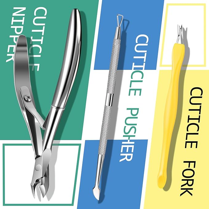 - Nail Prep Kit: Made of polished stainless steel. Nail clipper easily trimms the cuticle hard skin, hard cuticles and hangnails. Cuticle pusher with curved and triangular design can be used to push cuticles, clean nail cuticles or dirt, and remove gel nail polish. Cuticle fork removes cuticle at the edge of the nail