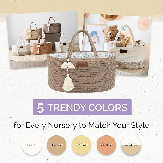 - STYLISH & DURABLE DESIGN - Our baby diaper caddy organiser features high-quality cotton rope and a unique and elegant inner lining. It comes in five different boho colors and has a cute decorative tassel to perfectly match your nursery.