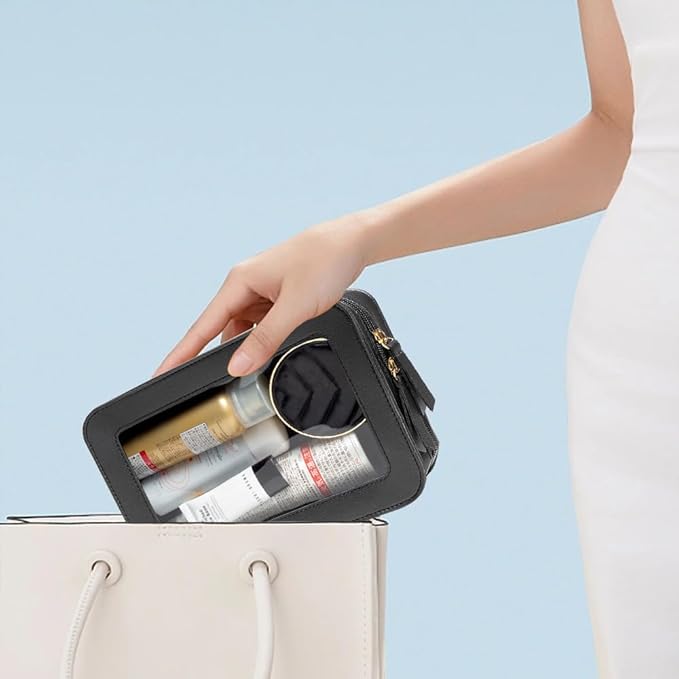 - Waterproof Premium PU: These travel toiletry bags are made of PU material,durable, and waterproof. Unlike other flimsy and collapsible pvc bags, Together with the beautiful stitches and compact leather zippers, this make up bag is durable for long-lasting use. Is easy to carrying in your handbag or carry-on Size:9.44“*6.1”*2.75“
