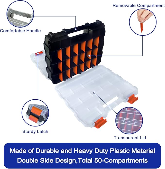 - Multiple Use Options Parts Organizer: 50-Compartment Double Sided Organizer with removable dividers of this organizer allow you to extend your garage storage options, declutter a storage cabinet, carry fishing lures, or Screws, Bolts, Nails, Beads, Jewelry. All removable dividers are easily slide on and off to customize the storage space