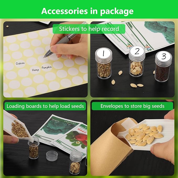 - Elevate your seed storage with our kit! 70 labeling stickers for quick identification, a loading board for streamlined organization, and now, 10 extra-large seed envelopes. Keep your seeds in top-notch condition, effortlessly.