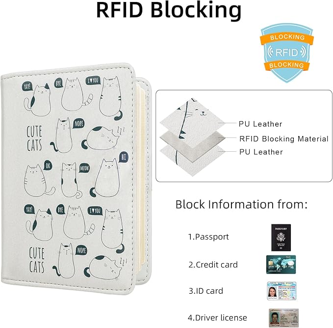 - Security Passport Book Protector: With RFID blocking shield material inside, this RFID Blocking passport wallet helps prevent personal account information disclosure. Comes with an elastic strap which can secure items inside, rfid wallet will not open in your bag or luggage
