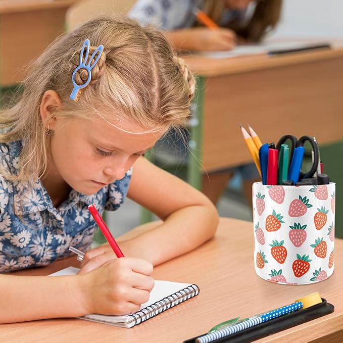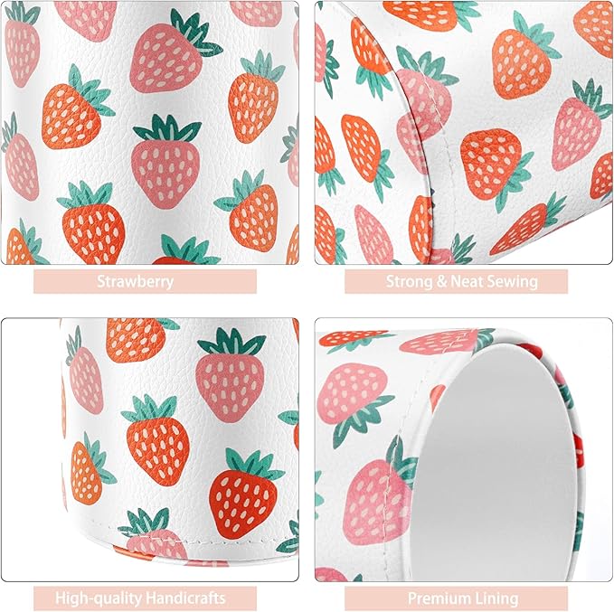 WAVEYU Pen Holder for Women Girls, Pencil Cup Pink Desk Decor, Makeup Brush Holder Large Pu Leather Multi-Functional Organizer Cup for Office, Classroom, Home, Strawberry