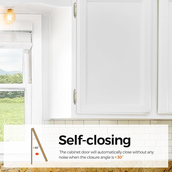 - Self Closing Automatically: The cabinet door will automatically close without any noise when the kitchen cabinet hinges closure angle is less than 30°. Just gently push the cabinet doors and the hinges will be self-closing