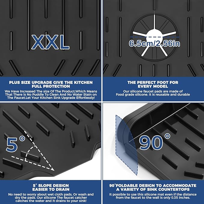 - ๐ชใ5ยฐ UPGRADE VERSIONใ Silicone sink faucet mat with upgraded 5ยฐ slope design and upgraded 0.79" (2 cm) thickness, the kitchen faucet splash guard allows captured water to flow into the sink faster, resulting in faster drying of the kitchen sink. This means never gets soggy, or not having any water spots by the sink faucet. You don't need to worry about the water staying on the sink & bathroom counter. Upgrading your kitchen sink & bathroom countertop in an effort-saving way!