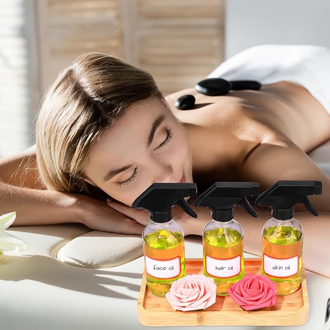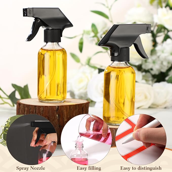 Fumete 2 Pack Glass Bottles 4oz Empty Refillable Liquid Containers with 1 Label 1 Funnel for Essential Oils Hair Travel Plants Cleaning Skin Care(Clear, Black Top,Spray Bottle)