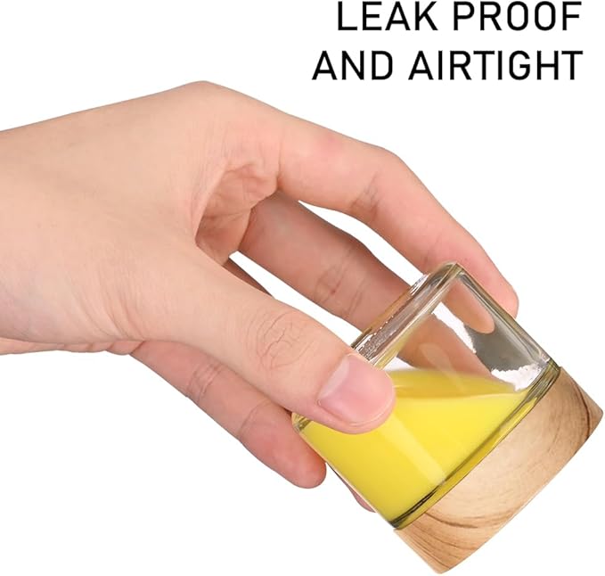 - High-Quality: These 1 oz glass jars with lids are made of strong thick glass, plastic woodgrain lids with soft plastic cones on the inside to ensure no leakage. The conical inner cap tightly adheres to the bottle mouth to ensure an airtight seal.