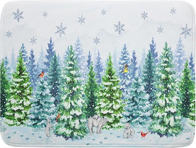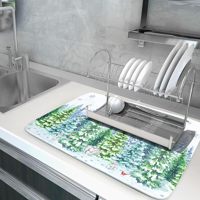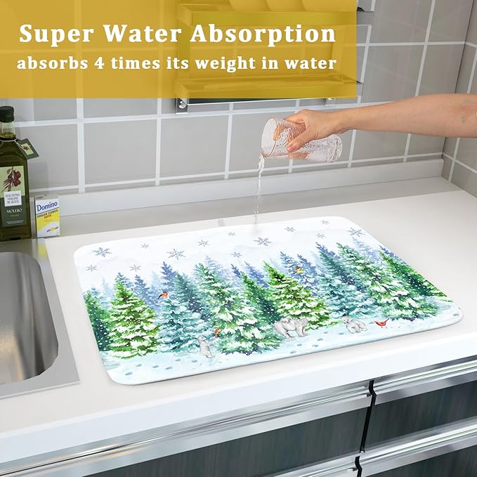 - 【SIZE】 The Winter Drying Mat Measure 18 x 24 Inch (45.7 x 60.9 CM) for You. Fit Most Countertop Space. Different Design on 2 Sides, One Side Can Suck Moisture with Natural Winter Snowy Forest Tree, Bears and Birds Pattern, Another One Gray Non-slip Side.