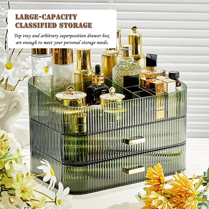Makeup Organizer with Drawers, Stackable Cosmetics Organizer, Large Make Up Organizer Storage Box, Ideal for Bathroom Countertop and Desk (1 x Drawer, Green)