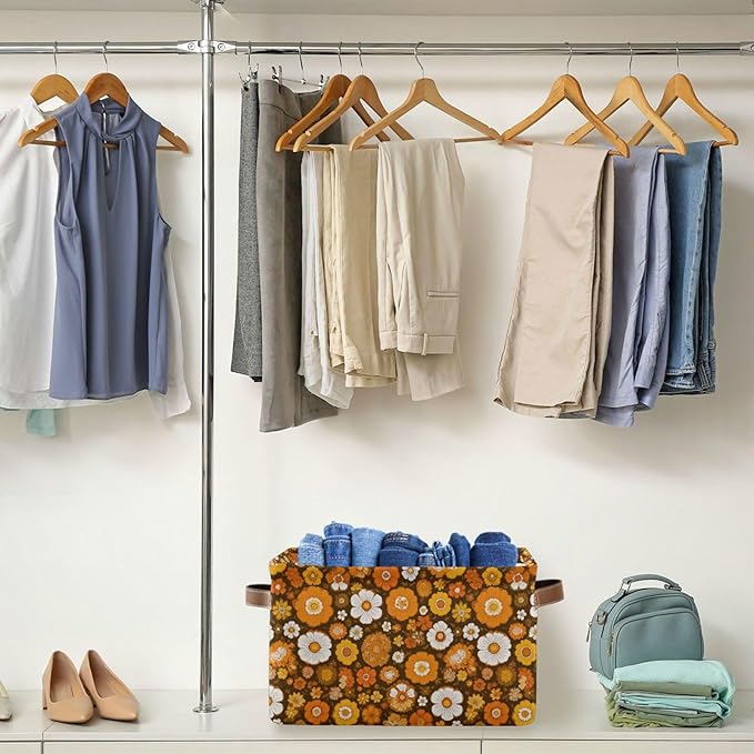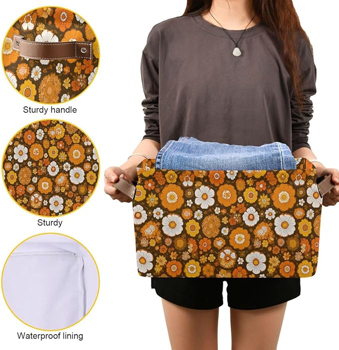 Aslsiy Storage Basket Orange 60s 70s Style Nursery Bins Retro Floral Baby Box Canvas Clothes Shelf Basket Laundry Hamper Gift Baskets for Home Closet 1 Pcs